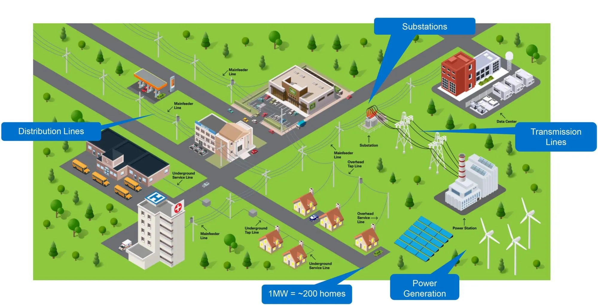 Camino de la electricidad desde las centrales eléctricas hasta los centros de datos.