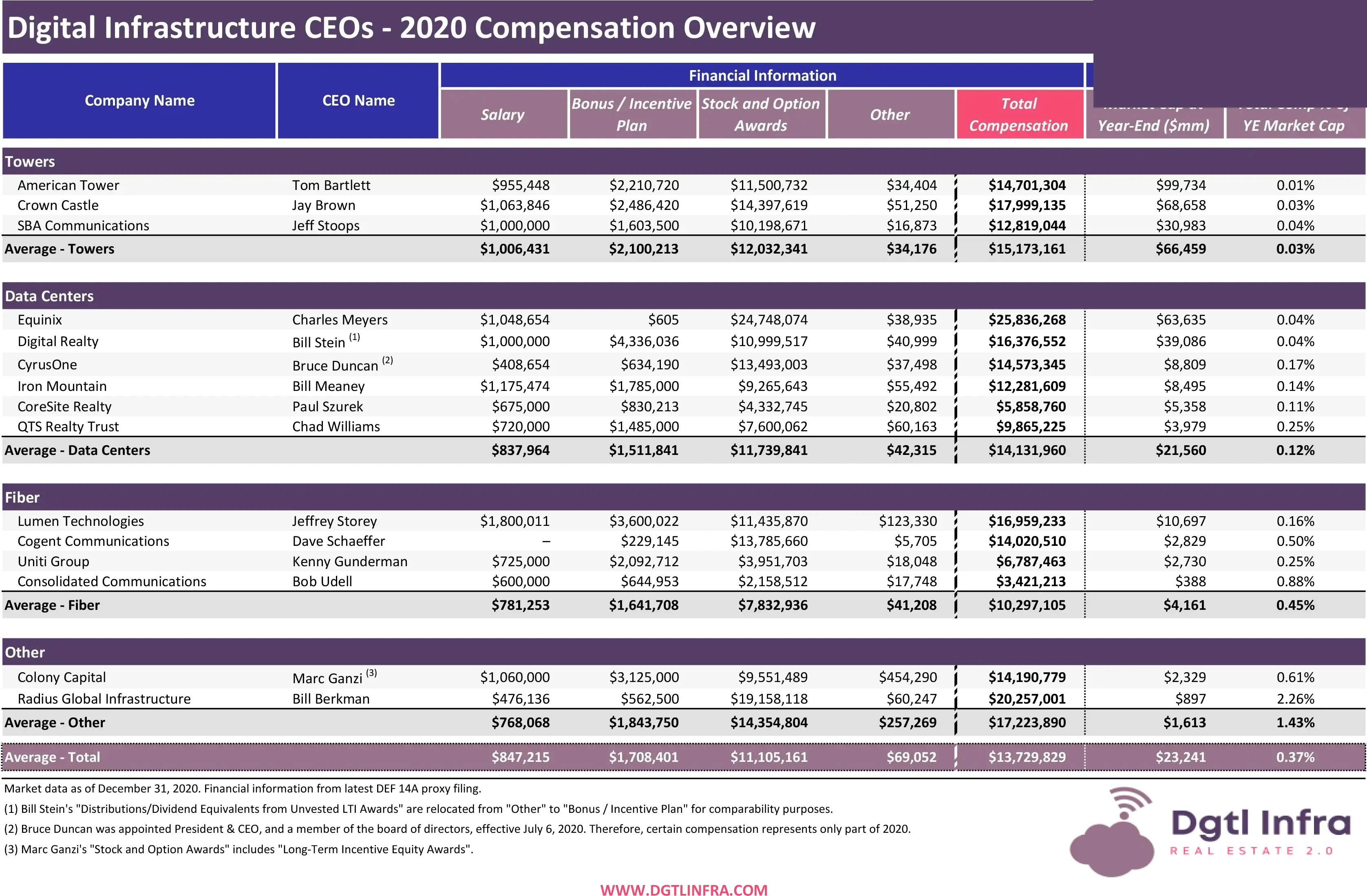 A continuación se muestra el informe inaugural de Centro Infra que revisa las declaraciones de representación en todo el sector de infraestructura digital, centrándose en la remuneración total de los directores ejecutivos (CEO) durante 2020 y comparándola con la capitalización de mercado respectiva de cada empresa a finales de 2020. De hecho, este análisis intenta captar todas las formas de remuneración de los directores ejecutivos de infraestructura digital, incluidos salarios, bonificaciones y premios de acciones y opciones.