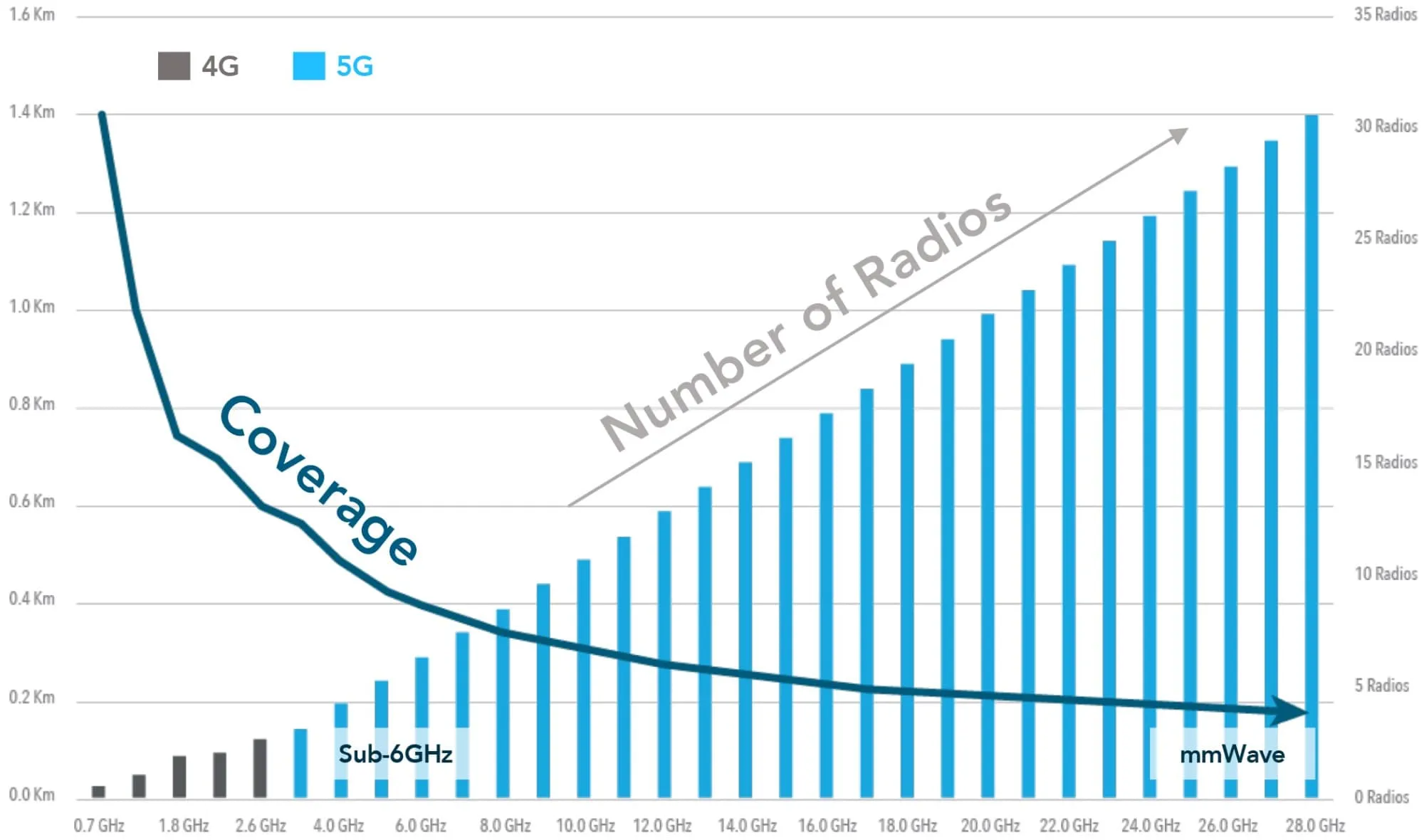 Además, a medida que se implemente un espectro de banda más alta, como sub-6 gigahercios (GHz) y ondas milimétricas (mmWave) para 5G (barras de color azul claro a continuación), se necesitarán más radios y, por lo tanto, celdas más pequeñas. Esto se debe a que estos activos de espectro 5G tienen características de propagación más limitadas (consulte la línea de cobertura a continuación) en comparación con el espectro de banda inferior que históricamente se ha implementado en macrocélulas.